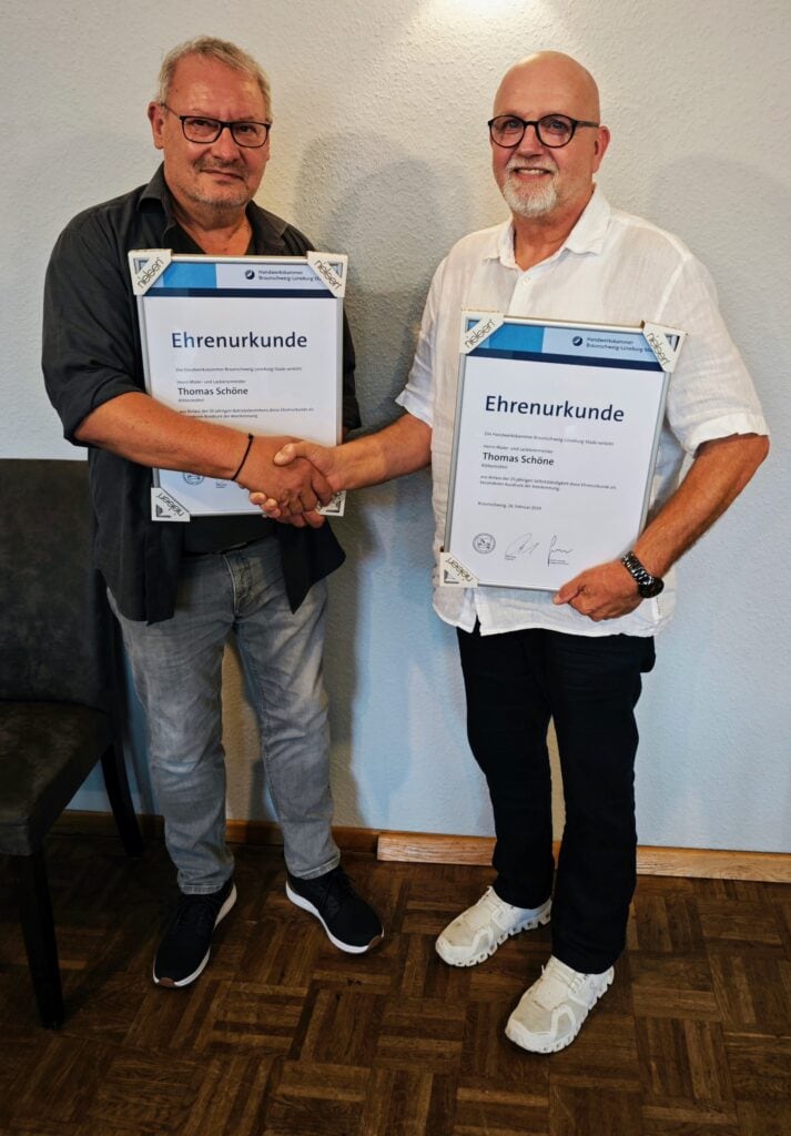 Gleich zwei Urkunden nahm Maler- und Lackierermeister Thomas Schöne, Ribbesbüttel, in Empfang, eine für die 25-jährige Selbstständigkeit und die andere für das bereits 50-jährige Bestehen des Betriebes.
